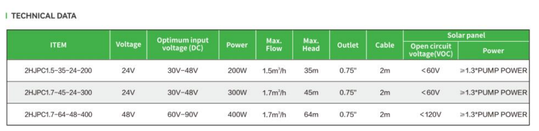 Selecting the solar pump model that meets your requirements against the pump model number table.